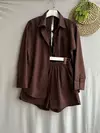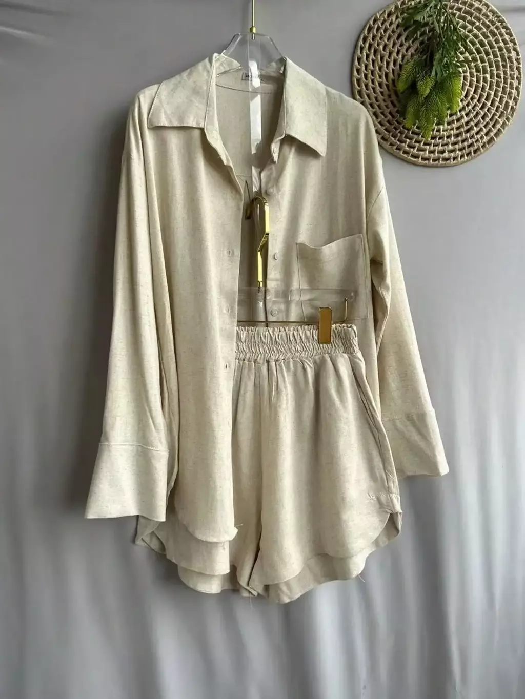 Conjunto feminino, conjunto de linho, conjunto de linho feminino, conjunto feminino de linho, conjunto camisa e short, camisa e short — Esse conjunto de linho combina conforto e estilo em duas peças modernas: camisa de manga longa e short com caimento impecável. Uma escolha versátil para a praia, encontros sociais ou looks elegantes do dia a dia.